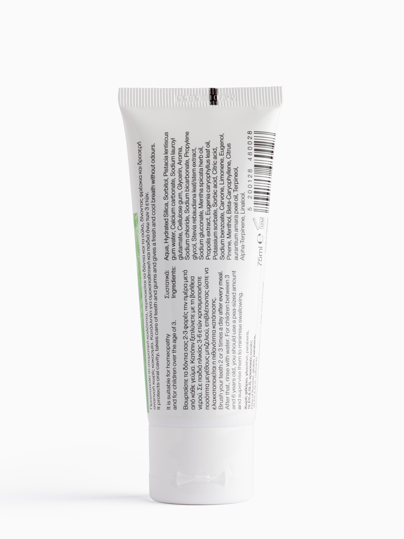 Η οδοντόκρεμα με δυόσμο, πρόπολη και μαστιχόνερο περιποιείται και καθαρίζει αποτελεσματικά τη στοματική κοιλότητα. -Το μαστιχόνερο έχει ισχυρή αντιμικροβιακή και αντιβακτηριακή δράση και συμβάλλει αποτελεσματικά στον καθαρισμό και την απομάκρυνση των βακτηρίων που διαταράσσουν τη στοματική υγιεινή. -Η πρόπολη έχει αντιφλεγμονώδεις ιδιότητες και βοηθά στην καταπράυνση της φλεγμονής των ούλων προστατεύοντας από την ουλίτιδα. Έχει αντισηπτικές, μυκητοκτόνες και αντιμικροβιακές ιδιότητες με αποτέλεσμα να εξουδετερώνει τα μικρόβια που αναπτύσσονται στη στοματική κοιλότητα. -Το έλαιο δυόσμου και το έλαιο των φύλλων του δενδρολίβανου έχουν αντιμικροβιακές ιδιότητες και χαρίζουν δροσερή αναπνοή. -Περιέχει στέβια, η οποία είναι φυσική πηγή σακχάρων και δεν επηρεάζει την υγεία των δοντιών.